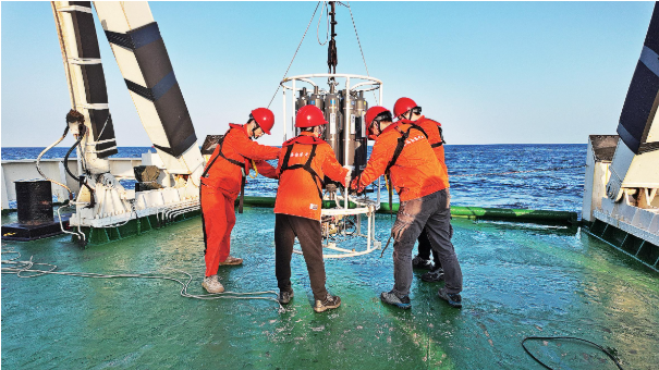 调查队员将 CTD(温盐深仪)采水器回收至后甲板。
